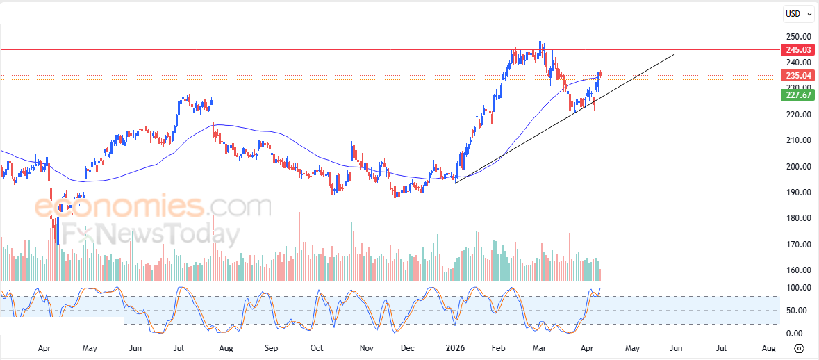 Siksi odotamme osakekurssin nousevan tulevien kaupankäyntisessioiden aikana niin kauan kuin 227,65 dollarin tukitaso pysyy ennallaan ja tähtäävän keskeiseen vastustasoon 245,00 dollarissa.