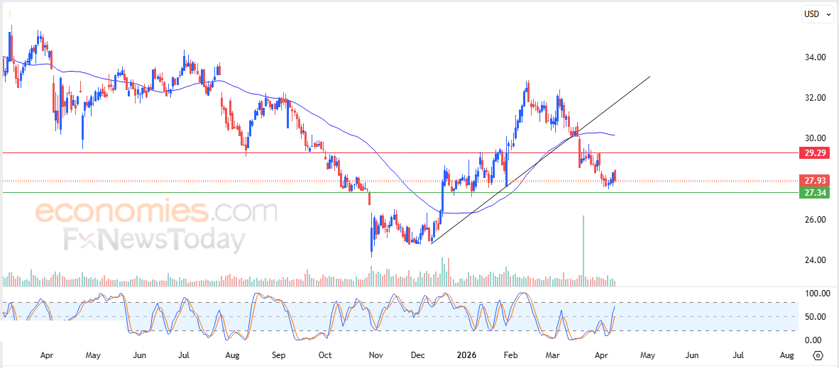 Siksi odotamme osakekurssin laskevan tulevien kaupankäyntisessioiden aikana niin kauan kuin 29,30 dollarin vastustaso pysyy ennallaan ja tähtäävän ensimmäiseen tärkeään tukitasoon 27,35 dollariin.