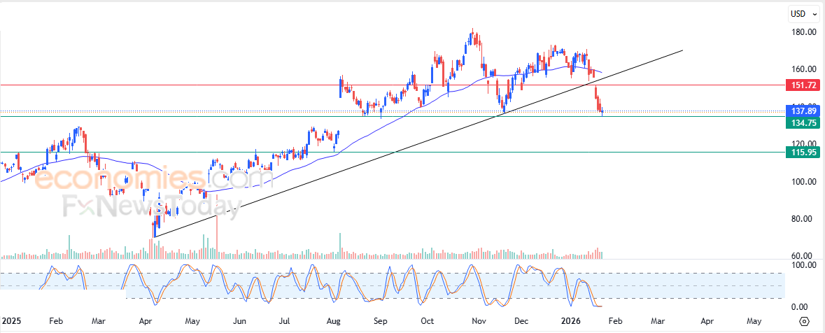 Siksi odotamme osakekurssin laskevan tulevassa kaupankäynnissä, erityisesti jos se rikkoutuu 134,75 dollarin tukitason alapuolelle, ja tavoittelevan seuraavaa tukitasoa 116,00 dollarissa.